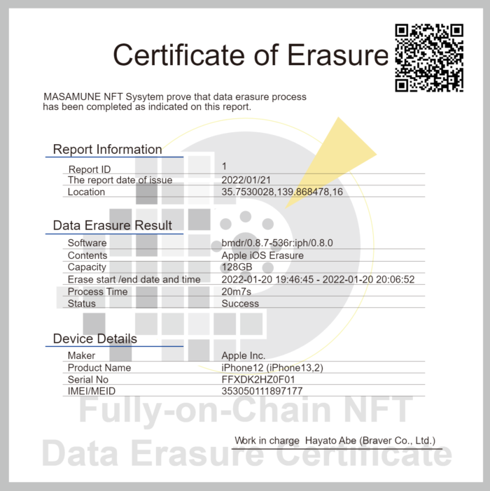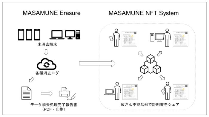 株式会社ブレイバーはこれまで企業・官公庁向けに提供していたスマートフォンデータ消去ソリューション『MASAMUNE Erasure』において、データ消去処理完了証明書をNFT(non-fungible token)で発行する機能を搭載致します。データ消去処理完了証明書を消去・改ざん不能なブロックチェーン上にNFTとして発行することにより、データ消去を依頼したクライアントはいつ、どこで、だれが端末の消去をしたのかを誰でも確認することができるようになります。