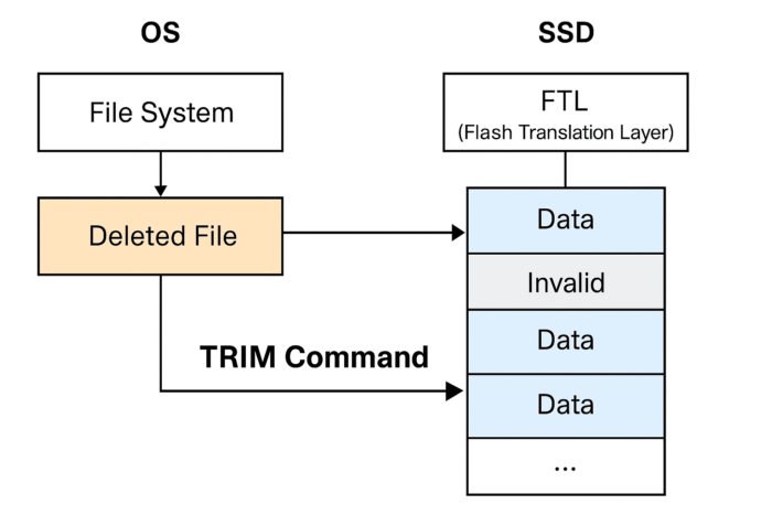 SSDは「FTL(Flash Translation Layer)」という仕組みで、物理メモリとOSの論理アドレスの対応関係を管理しています。TRIMが発行されると、その対応関係は解除され、以後はOSからその領域にアクセスしても**「空の領域」として扱われる**ようになります。
